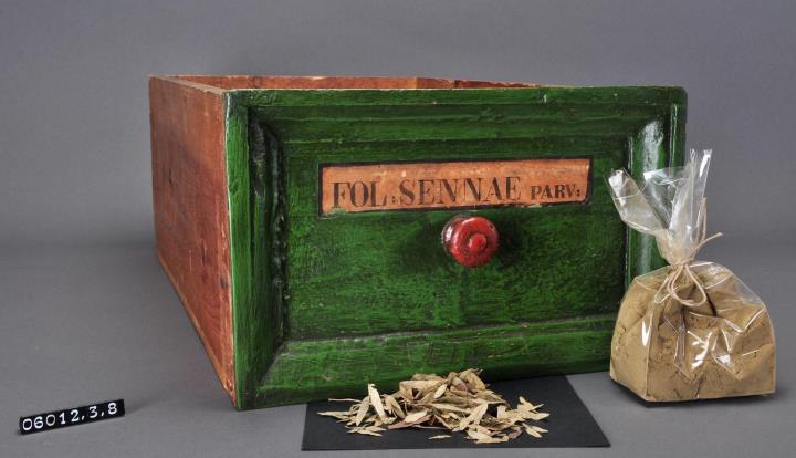 Schublade aus Nadelholz mit rotem Knauf und profilierter Vorderseite. Profil aufgeleimt und mit Holznägeln gesichert. Gezinkte Verbindungen (Schwalbenschwanzverbindung). Boden angeleimt und ebenfalls mit Holznägeln gesichert. Vorderfront grün, mit aufgeklebter, schwarz umrandeter, bräunlicher Papiersignatur. Enthält Kleine Senna, alexandrinische und tripolitanische in Pulver und Bruchstücken.