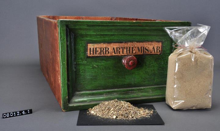 Schublade aus Nadelholz mit rotem Knauf und profilierter Vorderseite. Profil aufgeleimt und mit Holznägeln gesichert. Gezinkte Verbindungen (Schwalbenschwanzverbindung). Boden angeleimt und ebenfalls mit Holznägeln gesichert. Vorderfront grün, mit aufgeklebter, schwarz umrandeter, bräunlicher Papiersignatur. Enthält Wermut-Kraut, geschnitten und Pulver.