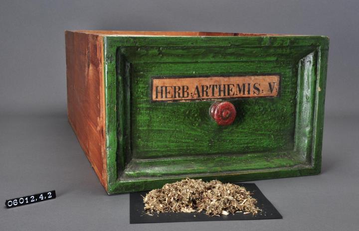 Schublade aus Nadelholz mit rotem Knauf und profilierter Vorderseite. Profil aufgeleimt und mit Holznägeln gesichert. Gezinkte Verbindungen (Schwalbenschwanzverbindung). Boden angeleimt und ebenfalls mit Holznägeln gesichert. Vorderfront grün, mit aufgeklebter, schwarz umrandeter, bräunlicher Papiersignatur. Enthält Beifuß-Kraut, geschnitten.