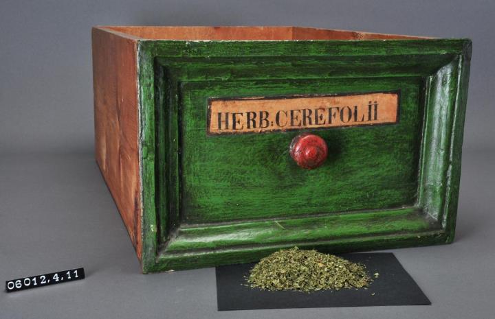 Schublade aus Nadelholz mit rotem Knauf und profilierter Vorderseite. Profil aufgeleimt und mit Holznägeln gesichert. Gezinkte Verbindungen (Schwalbenschwanzverbindung). Boden angeleimt und ebenfalls mit Holznägeln gesichert. Vorderfront grün, mit aufgeklebter, schwarz umrandeter, bräunlicher Papiersignatur. Enthält Kerbel-Kraut, geschnitten.