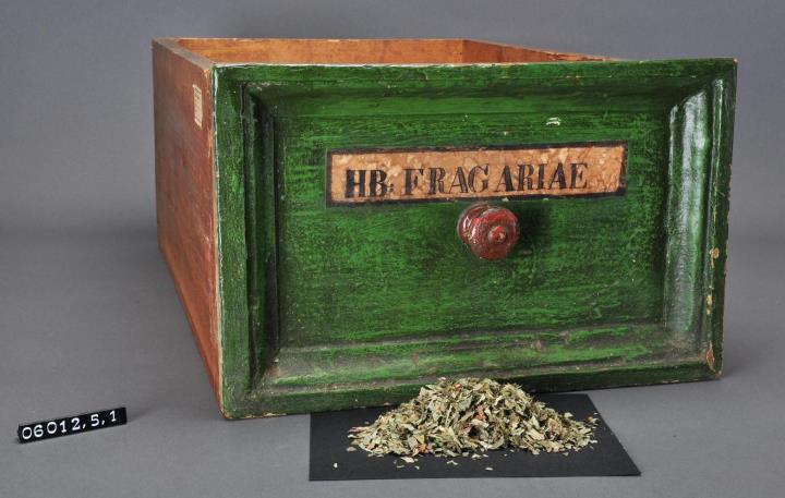 Schublade aus Nadelholz mit rotem Knauf und profilierter Vorderseite. Profil aufgeleimt und mit Holznägeln gesichert. Gezinkte Verbindungen (Schwalbenschwanzverbindung). Boden angeleimt und ebenfalls mit Holznägeln gesichert. Vorderfront grün, mit aufgeklebter, schwarz umrandeter, bräunlicher Papiersignatur. Enthält Erdbeer-Kraut (Blätter), geschnitten.