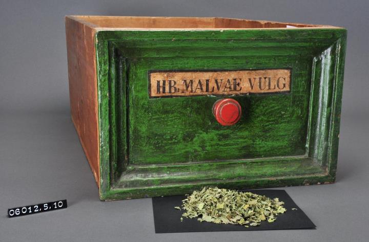 Schublade aus Nadelholz mit rotem Knauf und profilierter Vorderseite. Profil aufgeleimt und mit Holznägeln gesichert. Gezinkte Verbindungen (Schwalbenschwanzverbindung). Boden angeleimt und ebenfalls mit Holznägeln gesichert. Vorderfront grün, mit aufgeklebter, schwarz umrandeter, bräunlicher Papiersignatur. Enthält Malven- Kraut (Blätter), Käsepappel, geschnitten.