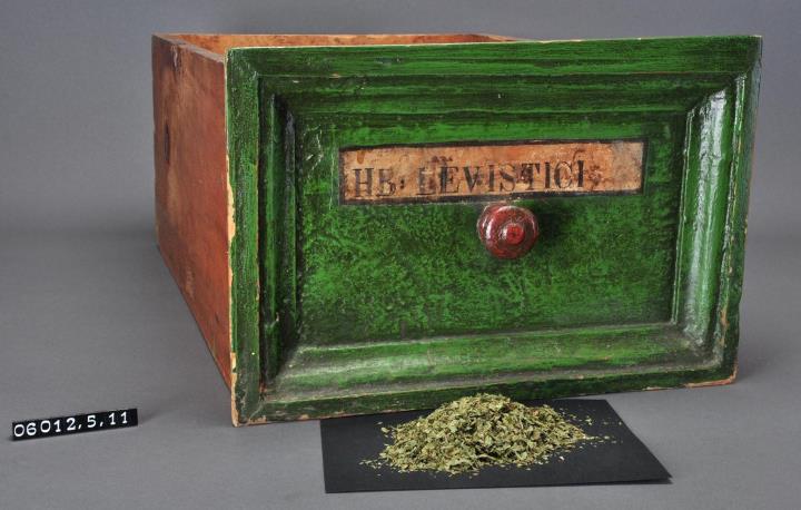 Schublade aus Nadelholz mit rotem Knauf und profilierter Vorderseite. Profil aufgeleimt und mit Holznägeln gesichert. Gezinkte Verbindungen (Schwalbenschwanzverbindung). Boden angeleimt und ebenfalls mit Holznägeln gesichert. Vorderfront grün, mit aufgeklebter, schwarz umrandeter, bräunlicher Papiersignatur. Enthält Liebstöckel-Kraut, geschnitten.