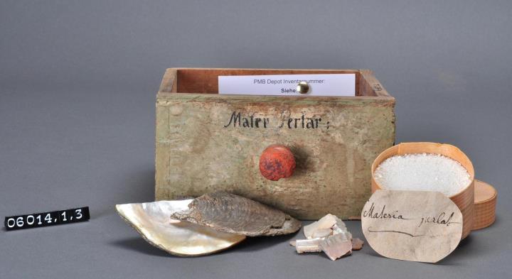 Schublade aus Nadelholz mit rotem Knauf und glatter Vorderseite. Gezinkte Verbindungen (Schwalbenschwanzverbindung). Durchgehender Boden angeleimt und mit Holznägeln gesichert. Vorderfront grün, mit schwarzer Signatur händisch beschriftet. Enthält Perlmutt, große Stücke, kleine Bruchstücke und Spanschachtel mit zerstoßenem Perlmutt "Mater perlat(a)".