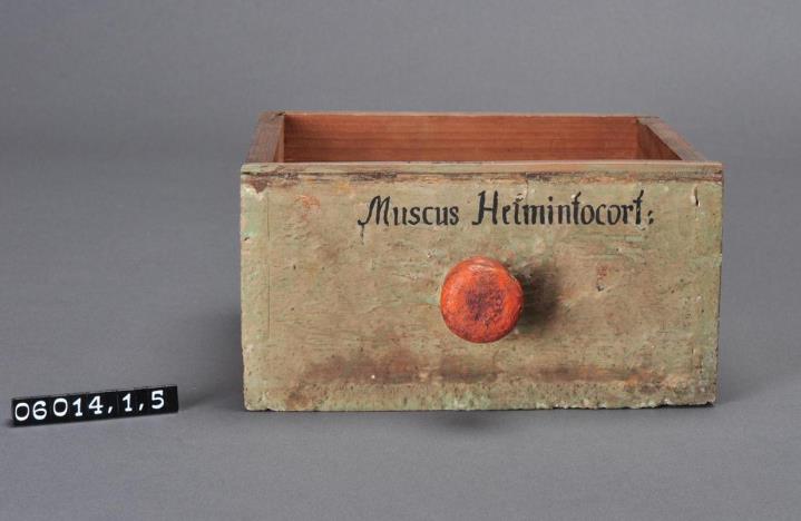 Schublade aus Nadelholz mit rotem Knauf und glatter Vorderseite. Gezinkte Verbindungen (Schwalbenschwanzverbindung). Durchgehender Boden angeleimt und mit Holznägeln gesichert. Vorderfront grün, mit schwarzer Signatur händisch beschriftet. Enthielt Korsikanisches Wurmmoos, Muscus corsicanus.