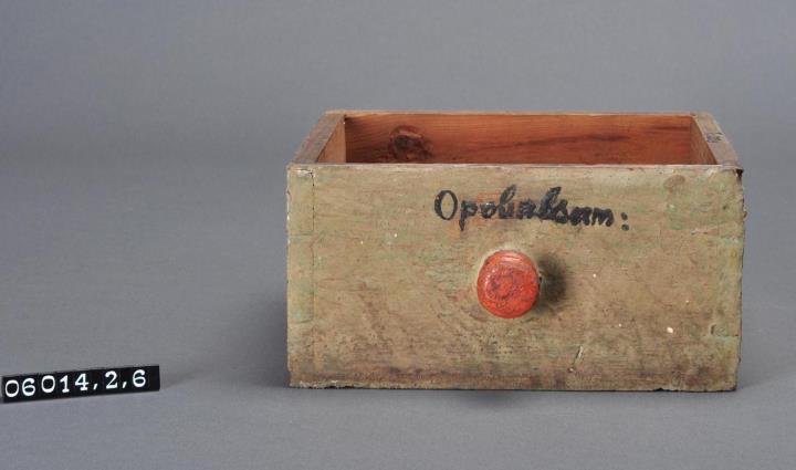 Schublade aus Nadelholz mit rotem Knauf und glatter Vorderseite. Gezinkte Verbindungen (Schwalbenschwanzverbindung). Durchgehender Boden angeleimt und mit Holznägeln gesichert. Vorderfront grün, mit schwarzer Signatur händisch beschriftet. Enthielt Mekkabalsam, Jüdischer Balsam; Balsamum judaicum, Balsamum orientale.