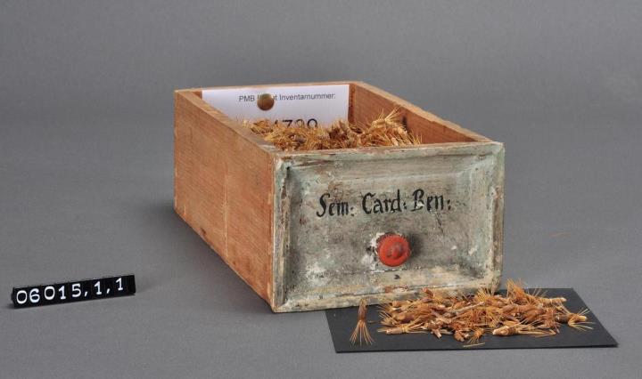 Schublade aus Nadelholz mit rotem Knauf und profilierter Vorderseite, unregelmäßigem Grundriss, individuell an den Schrank angepasst. Gezinkte Verbindungen (Schwalbenschwanzverbindung). Boden angeleimt. Vorderfront grün, mit schwarzer Signatur händisch beschriftet. Enthält Kardobenedikten-Samen als Ganzdroge .