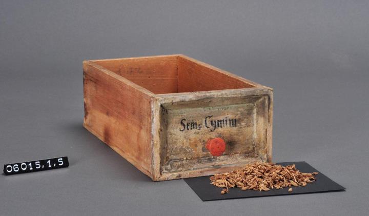 Schublade aus Nadelholz mit rotem Knauf und profilierter Vorderseite, unregelmäßigem Grundriss, individuell an den Schrank angepasst. Gezinkte Verbindungen (Schwalbenschwanzverbindung). Boden angeleimt. Vorderfront grün, mit schwarzer Signatur händisch beschriftet. Enthält römischen Kümmel als Ganzdroge.