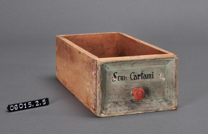 Schublade aus Nadelholz mit rotem Knauf und profilierter Vorderseite, unregelmäßigem Grundriss, individuell an den Schrank angepasst. Gezinkte Verbindungen (Schwalbenschwanzverbindung). Boden angeleimt. Vorderfront grün, mit schwarzer Signatur händisch beschriftet. Enthielt Saflorsamen.