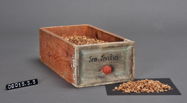 Schublade aus Nadelholz mit rotem Knauf und profilierter Vorderseite, unregelmäßigem Grundriss, individuell an den Schrank angepasst. Gezinkte Verbindungen (Schwalbenschwanzverbindung). Boden angeleimt. Vorderfront grün, mit schwarzer Signatur händisch beschriftet. Enthält Liebstöckel-Samen als Ganzdroge.