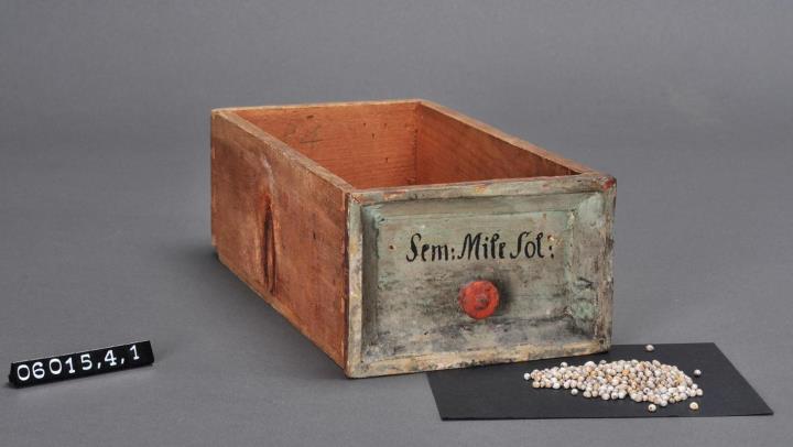 Schublade aus Nadelholz mit rotem Knauf und profilierter Vorderseite, unregelmäßigem Grundriss, individuell an den Schrank angepasst. Gezinkte Verbindungen (Schwalbenschwanzverbindung). Boden angeleimt. Vorderfront grün, mit schwarzer Signatur händisch beschriftet. Außen an der rechten Schubladenseite altes Preisschild. Enthält Steinsamen als Ganzdroge.