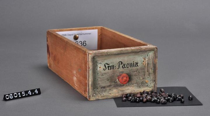 Schublade aus Nadelholz mit rotem Knauf und profilierter Vorderseite, unregelmäßigem Grundriss, individuell an den Schrank angepasst. Gezinkte Verbindungen (Schwalbenschwanzverbindung). Boden angeleimt. Vorderfront grün, mit schwarzer Signatur händisch beschriftet. Enthält Pfingstrosen-Samen als Ganzdroge.
