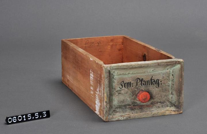 Schublade aus Nadelholz mit rotem Knauf und profilierter Vorderseite, unregelmäßigem Grundriss, individuell an den Schrank angepasst. Gezinkte Verbindungen (Schwalbenschwanzverbindung). Boden angeleimt. Vorderfront grün, mit schwarzer Signatur händisch beschriftet. Enthielt Wegerich-Samen.