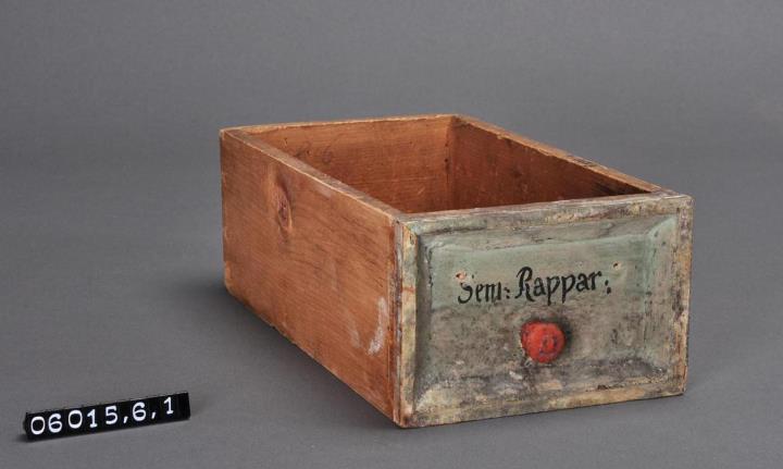 Schublade aus Nadelholz mit rotem Knauf und profilierter Vorderseite, unregelmäßigem Grundriss, individuell an den Schrank angepasst. Gezinkte Verbindungen (Schwalbenschwanzverbindung). Boden angeleimt. Vorderfront grün, mit schwarzer Signatur händisch beschriftet. Enthielt Rübensamen.