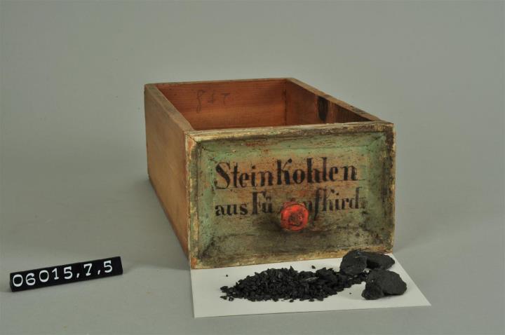 Schublade aus Nadelholz mit rotem Knauf und profilierter Vorderseite, unregelmäßigem Grundriss, individuell an den Schrank angepasst. Gezinkte Verbindungen (Schwalbenschwanzverbindung). Boden angeleimt. Vorderfront grün, mit schwarzer Signatur händisch beschriftet. Enthält Steinkohle in größeren und kleinen Bruchstücken.