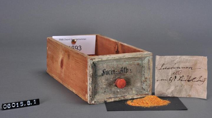 Schublade aus Nadelholz mit rotem Knauf und profilierter Vorderseite, unregelmäßigem Grundriss, individuell an den Schrank angepasst. Gezinkte Verbindungen (Schwalbenschwanzverbindung). Boden angeleimt. Vorderfront grün, mit schwarzer Signatur händisch beschriftet. Enthält: Weißen Bernstein (fossiles Coniferenharz), zerstoßen und ein Stück Papier mit historischer Beschriftung "Succinum album nebst Beuteltuch" (?).
