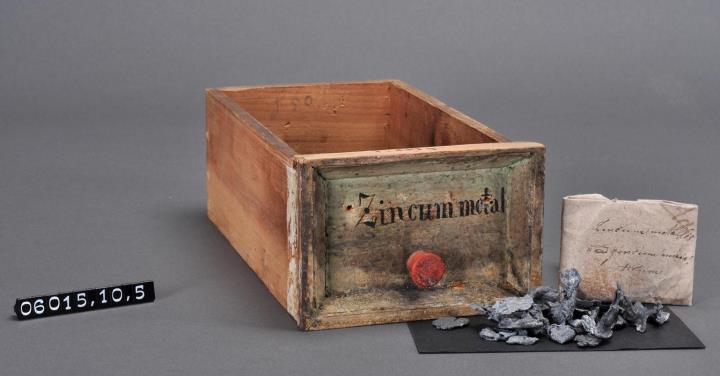 Schublade aus Nadelholz mit rotem Knauf und profilierter Vorderseite, unregelmäßigem Grundriss, individuell an den Schrank angepasst. Gezinkte Verbindungen (Schwalbenschwanzverbindung). Boden angeleimt. Vorderfront grün, mit schwarzer Signatur händisch beschriftet. Enthält metallisches Zink in kleineren Stücken und ein Briefchen mit einem flachen Stück, historisch beschriftet "Zincum metallic. ad Zincum muriat." (letztes Wort unleserlich);.