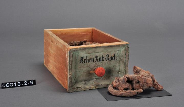 Schublade aus Nadelholz mit rotem Knauf und profilierter Vorderseite, unregelmäßigem Grundriss, individuell an den Schrank angepasst. Gezinkte Verbindungen (Schwalbenschwanzverbindung). Boden angeleimt. Vorderfront grün, mit schwarzer Signatur händisch beschriftet. Enthält Rote Behenwurzel als Ganzdroge.