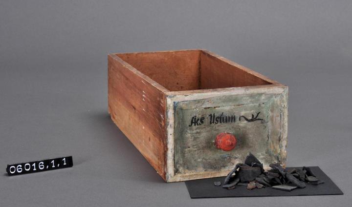 Schublade aus Nadelholz mit rotem Knauf und profilierter Vorderseite, unregelmäßigem Grundriss, individuell an den Schrank angepasst. Gezinkte Verbindungen (Schwalbenschwanzverbindung). Boden angeleimt. Vorderfront grün, mit schwarzer Signatur händisch beschriftet. Enthält gebranntes Kupfer in Bruchstücken.