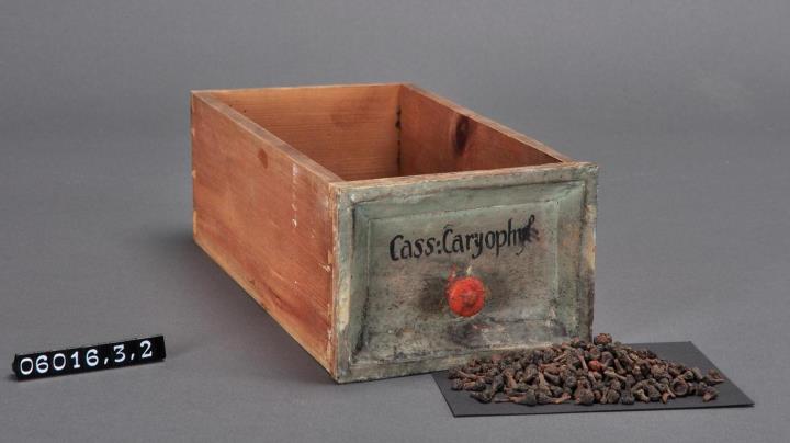 Schublade aus Nadelholz mit rotem Knauf und profilierter Vorderseite, unregelmäßigem Grundriss, individuell an den Schrank angepasst. Gezinkte Verbindungen (Schwalbenschwanz-Verbindung). Boden angeleimt. Vorderfront grün, mit schwarzer Signatur händisch beschriftet. Enthält Nelkenrinde als Ganzdroge.