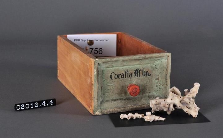 Schublade aus Nadelholz mit rotem Knauf und profilierter Vorderseite, unregelmäßigem Grundriss, individuell an den Schrank angepasst. Gezinkte Verbindungen (Schwalbenschwanzverbindung). Boden angeleimt. Vorderfront grün, mit schwarzer Signatur händisch beschriftet. Enthält weiße Korallen als Ganzdroge.