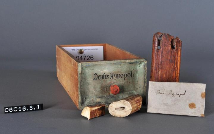Schublade aus Nadelholz mit rotem Knauf und profilierter Vorderseite, unregelmäßigem Grundriss, individuell an den Schrank angepasst. Gezinkte Verbindungen (Schwalbenschwanzverbindung). Boden angeleimt. Vorderfront grün, mit schwarzer Signatur händisch beschriftet. Enthält Walrosszähne als Ganzdroge und ein historisch beschriftetes Pulverbriefchen.