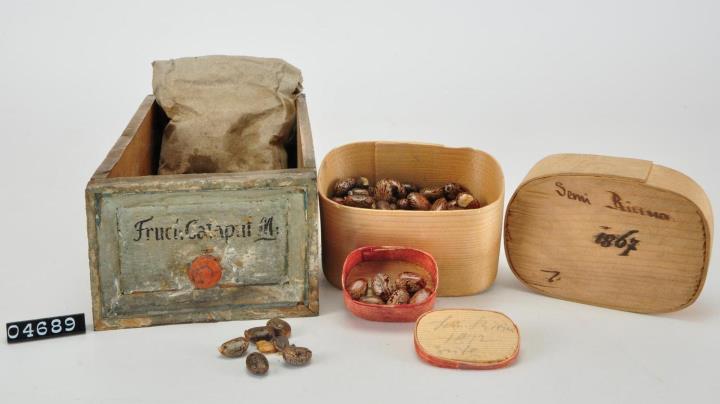 Schublade aus Nadelholz mit rotem Knauf und profilierter Vorderseite, unregelmäßiger Grundriss, individuell an den Schrank angepasst. Gezinkte Verbindungen (Schwalbenschwanzverbindung). Boden angeleimt. Vorderfront grün, mit schwarzer Signatur händisch beschriftet. Enthält Rizinus-Samen, Wunderkörner, Zeckenkörner als Ganzdroge. Der Strich über dem "M" (Majoris) weist darauf hin, dass es sich um Rizinussamen handelt. Des weiteren enthält die Schublade eine größere ovale Spandose aus Holz beschriftet mit "Semi ricino 1867" und eine kleinere ovale Spandose mit Bleistift beschriftet: "Semen ricini 1872 -gute".