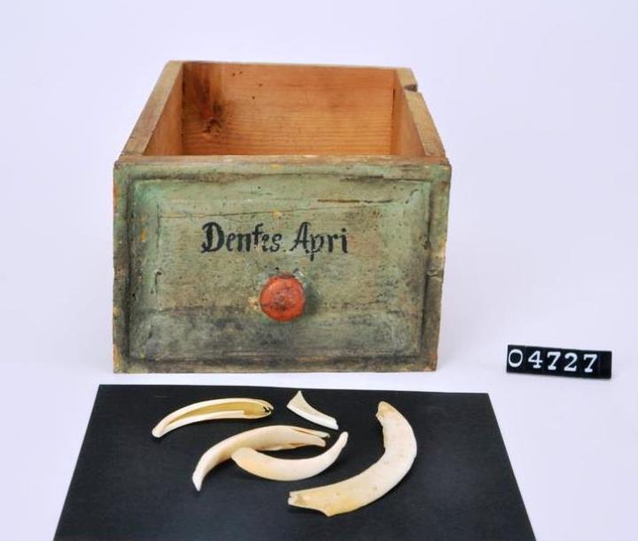 Schublade aus Nadelholz mit rotem Knauf und profilierter Vorderseite, unregelmäßiger Grundriss, individuell an den Schrank angepasst. Gezinkte Verbindungen (Schwalbenschwanzverbindung). Boden angeleimt. Vorderfront grün, mit schwarzer Signatur händisch beschriftet. Enthält Eberzähne als Ganzdroge sowie kleine Bruchstücke.