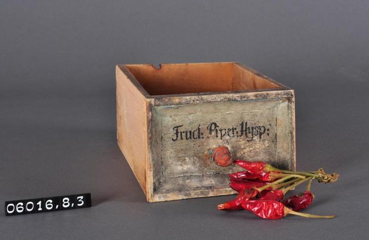 Schublade aus Nadelholz mit rotem Knauf und profilierter Vorderseite, unregelmäßiger Grundriss, individuell an den Schrank angepasst. Gezinkte Verbindungen (Schwalbenschwanzverbindung). Boden angeleimt. Vorderfront grün, mit schwarzer Signatur händisch beschriftet. Enthält Spanischer Pfeffer als Ganzdroge.