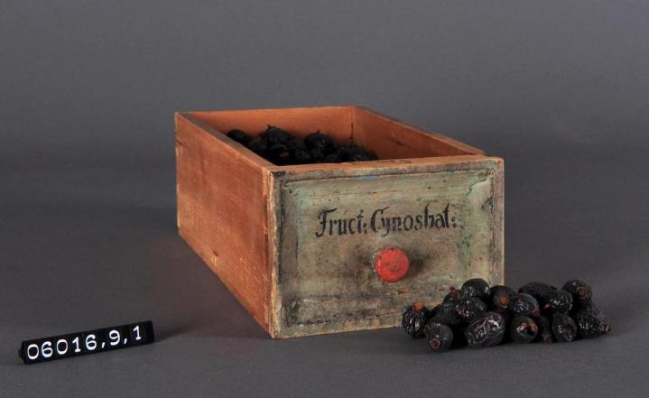 Schublade aus Nadelholz mit rotem Knauf und profilierter Vorderseite, unregelmäßiger Grundriss, individuell an den Schrank angepasst. Gezinkte Verbindungen (Schwalbenschwanzverbindung). Boden angeleimt. Vorderfront grün, mit schwarzer Signatur händisch beschriftet. Am rechten Seitenteil der Schublade befindet sich die historische Preisangabe: 20 Gramm = 3 Kreuzer. Enthält Hagebutten als Ganzdroge.