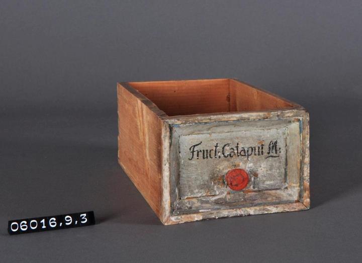 Schublade aus Nadelholz mit rotem Knauf und profilierter Vorderseite, unregelmäßigem Grundriss, individuell an den Schrank angepasst. Gezinkte Verbindungen (Schwalbenschwanzverbindung). Boden angeleimt. Vorderfront grün, mit schwarzer Signatur händisch beschriftet. Enthielt Springkörner, Purgierkörner. Bei Minores mit Strich unter dem "M" handelt es sich lt. Hahnemann um die Samen der Springwolfsmilch.