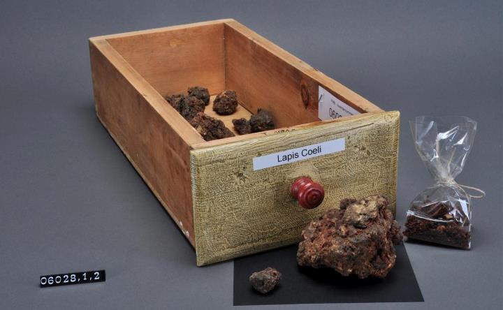 Schublade aus Nadelholz mit rotem Knauf und gezinkten Verbindungen (Schwalbenschwanzverbindung). Boden angeleimt und mit Holznägeln gesichert. Vorderfront auch aufgeleimt, maserierend grau-braun gestrichen. Mit Dymo-Band, schwarze Schrift auf weißem Grund, beschriftet. Enthält Himmelsstein, Lapis coeli, ganz und gepulvert.