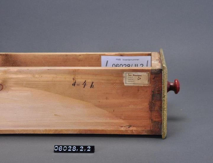 Schublade aus Nadelholz mit rotem Knauf und gezinkten Verbindungen (Schwalbenschwanzverbindung). Boden angeleimt und mit Holznägeln gesichert. Vorderfront auch aufgeleimt, maserierend grau-braun gestrichen. Mit Dymo-Band, schwarze Schrift auf weißem Grund, beschriftet. Seitlich altes Preisschild. Enthält Nierenstein, Lapis vitalis, ganz und Magnetstein, Pulver in hist. Papiertüte, beschriftet Lap:Magnet.pp. unica semis 4 Kreuzer.