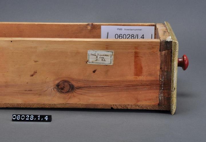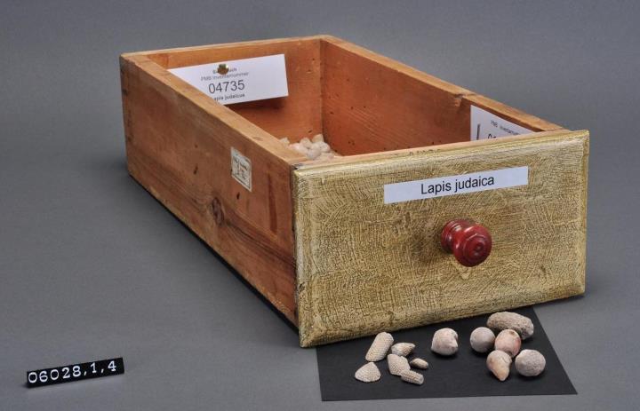 Schublade aus Nadelholz mit rotem Knauf und gezinkten Verbindungen (Schwalbenschwanzverbindung). Boden angeleimt und mit Holznägeln gesichert. Vorderfront auch aufgeleimt, maserierend grau-braun gestrichen. Mit Dymo-Band, schwarze Schrift auf weißem Grund, beschriftet. Enthält Lapis judaicus - Judenstein, Lapis iudaicus, Lapis syriacus. Männlein = länglich, Weiblein = rund/oval.