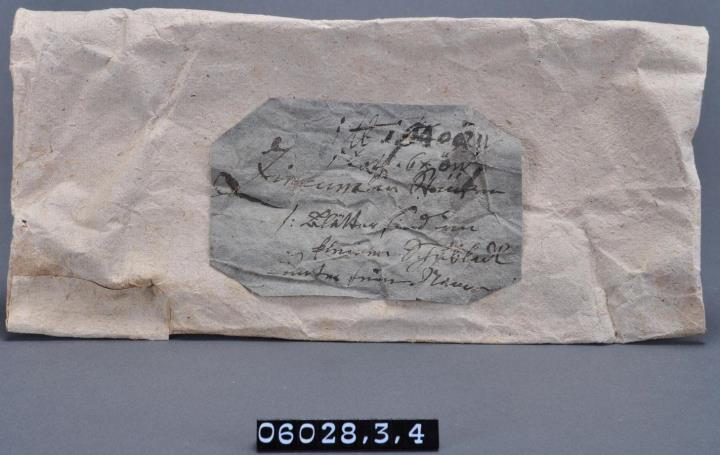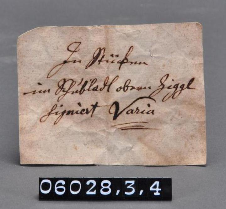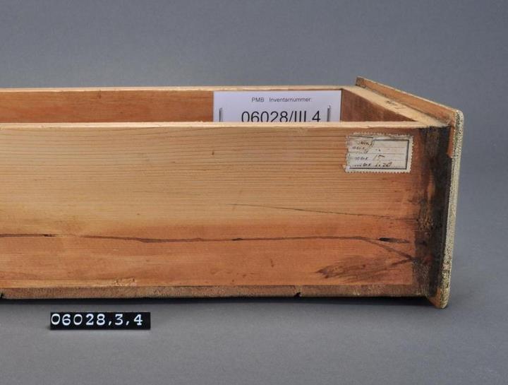 Schublade aus Nadelholz mit rotem Knauf und gezinkten Verbindungen (Schwalbenschwanzverbindung). Boden angeleimt und mit Holznägeln gesichert. Vorderfront auch aufgeleimt, maserierend grau-braun gestrichen. An seitlichem Schubladenteil altes Preisschild. Signatur: bedruckter Karton mit rotem Rand, schwarze Schrift auf ehemals weißem Grund. Enthält Metallisches Zink in großen Stücken ehemals in Tüte verpackt mit historischer Beschriftung: "Zincum in Stücken 1 Pfund / Blätter sind im kleinen Schubladl"; zusätzlich Zettel historisch beschriftet: "In Stücken im Schubladl obern Ziggl signiert Varia".