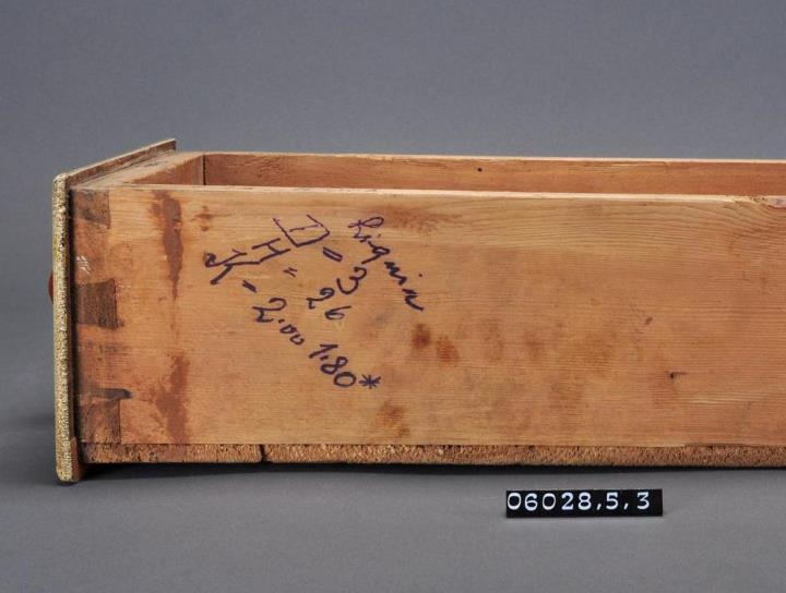 Schublade aus Nadelholz mit rotem Knauf und gezinkten Verbindungen (Schwalbenschwanzverbindung). Boden angeleimt und mit Holznägeln gesichert. Vorderfront auch aufgeleimt, maserierend grau-braun gestrichen. Seitlich schwarz beschriftet (Liquirizia und Preisangabe). Mit Dymo-Band, schwarze Schrift auf weißem Grund, beschriftet. Enthält Pistazien-Mastix hellgelb, Resina Lentiscina "electa" in Tropfen.