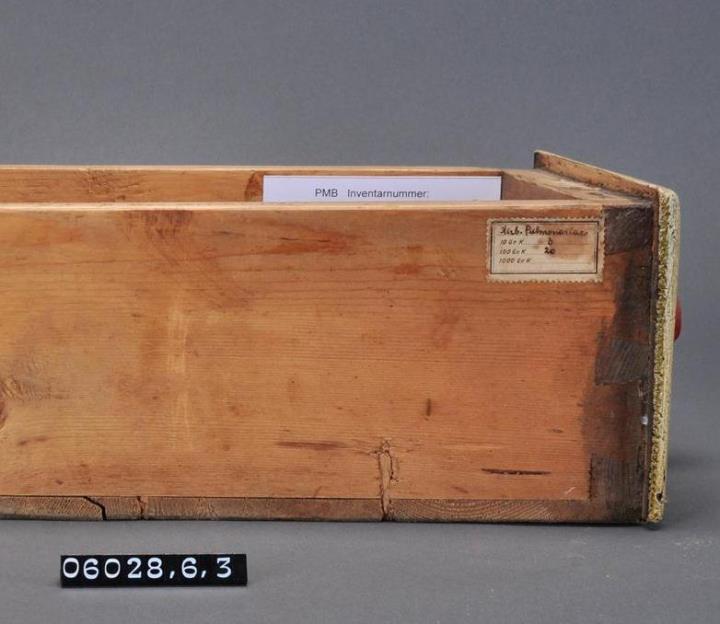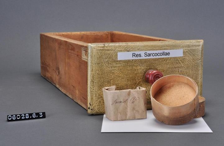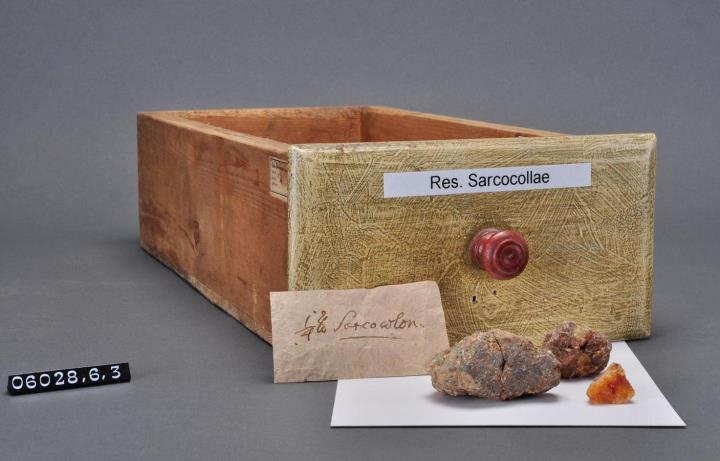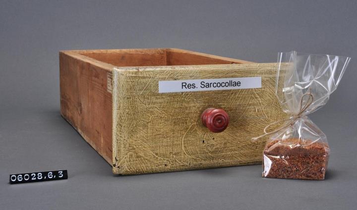 Schublade aus Nadelholz mit rotem Knauf und gezinkten Verbindungen (Schwalbenschwanzverbindung). Boden angeleimt und mit Holznägeln gesichert. Vorderfront auch aufgeleimt, maserierend grau-braun gestrichen. Seitlich altes Preisschild für Herb. Pulmonariae. Mit Dymo-Band, schwarze Schrift auf weißem Grund, beschriftet. Enthält Fischleim-Gummi als Ganzdroge, Pulver fein in einer Spanschachtel und ein historisch beschriftetes Pulverbriefchen sowie historischer Zettel beschriftet "1/4 Pfund Sarcocolon".