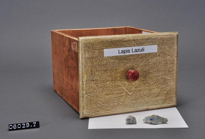 Schublade aus Nadelholz mit rotem Knauf und gezinkten Verbindungen (Schwalbenschwanzverbindung). Boden angeleimt und mit Holznägeln gesichert. Vorderfront auch aufgeleimt, maserierend grau-braun gestrichen. Seitlichg altes Preischild für Hb. Trifol.fibrin. und links für Emplas. ... Signatur: schwarz beschriftetes Dymo-Band auf weißem Grund. Enthält Lapislazuli, in Stücken in einer Spanschachtel beschriftet mit "Lapis Lazuli".