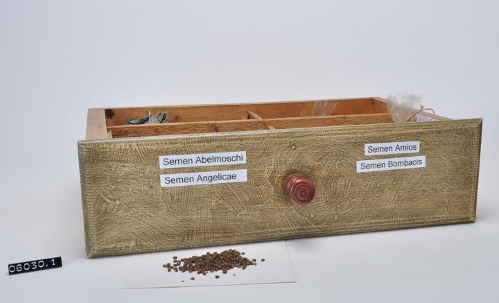 Schublade aus Nadelholz mit rotem Knauf für Kräuterdrogen. Vorderseite ist grau-braun maserierend angemalen. Die Schubladenseitenteile haben eine Schwalbenschwanzverbindung. Boden angeleimt und mit Holznägeln gesichert. Innenseite der Schublade viergeteilt. Signatur mit Dymo-Band. Ein Abteil enthält Bisam-Körner als Ganzdroge.