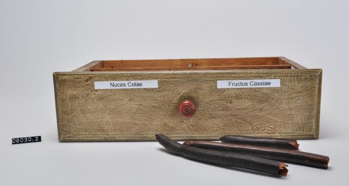 Schublade aus Nadelholz mit rotem Knauf für Kräuterdrogen. Vorderseite ist grau-braun maserierend angemalen. Die Schubladenseitenteile haben eine Schwalbenschwanzverbindung. Boden angeleimt und mit Holznägeln gesichert. Innenseite der Schublade viergeteilt. Signatur mit Dymo-Band. Ein Abteil enthält Röhrenkassie, gebrochen, drei Stück.