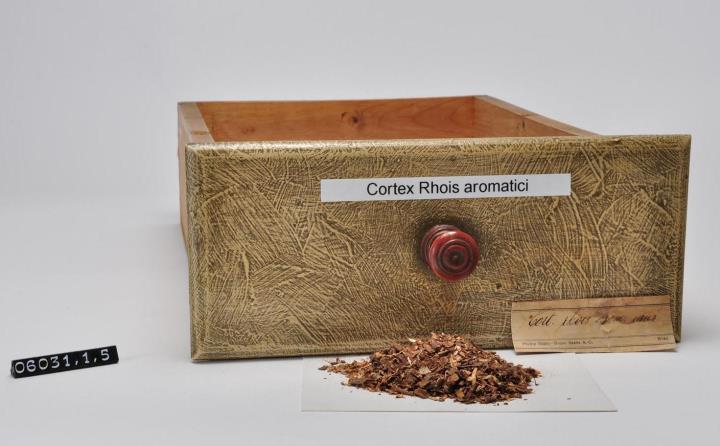 Schublade für Kräuterdrogen aus Nadelholz mit rotem Knauf. Vorderseite angeleimt, grau-braun maserierend angemalen. Die Schubladenseitenteile haben eine Schwalbenschwanzverbindung. Boden angeleimt und mit Holznägeln gesichert. Signatur mit Dymo-Band. Enthält Gewürzsumach-Rinde, geschnitten der Fa. Philipp Röder-Bruno Raabe A.G.Wien.