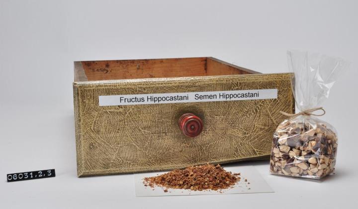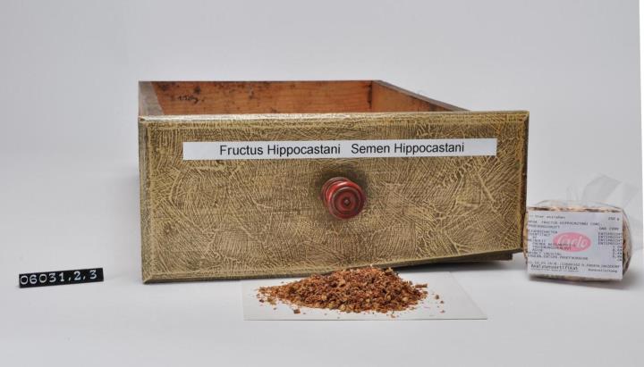 Schublade für Kräuterdrogen aus Nadelholz mit rotem Knauf. Vorderseite angeleimt, grau-braun maserierend angemalen. Unterkante etwas abgeschlagen. Die Schubladenseitenteile haben eine Schwalbenschwanzverbindung. Boden angeleimt und mit Holznägeln gesichert. Signatur mit Dymo-Band. Enthält Kastanienblüten, gerebelt und Kastanienfrüchte, Kastaniensamen, grob geschnitten.