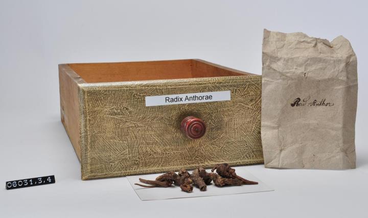Schublade für Kräuterdrogen aus Nadelholz mit rotem Knauf. Vorderseite angeleimt, grau-braun maserierend angemalen. Die Schubladenseitenteile haben eine Schwalbenschwanzverbindung. Boden angeleimt und mit Holznägeln gesichert. Signatur mit Dymo-Band. Enthält Giftheil-Wurzel, als Ganzdroge und ein historisch beschriftetes Papiersäckchen.
