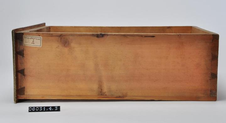Schublade für Kräuterdrogen aus Nadelholz mit rotem Knauf. Vorderseite angeleimt, grau-braun maserierend angemalen. Die Schubladenseitenteile haben eine Schwalbenschwanzverbindung. Boden angeleimt und mit Holznägeln gesichert. Seitliches, gezahntes Preisschild für Ammonium chloratum purum. Signatur mit Dymo-Band. Enthält Sonnenhut-Wurzel, geschnitten (2003).