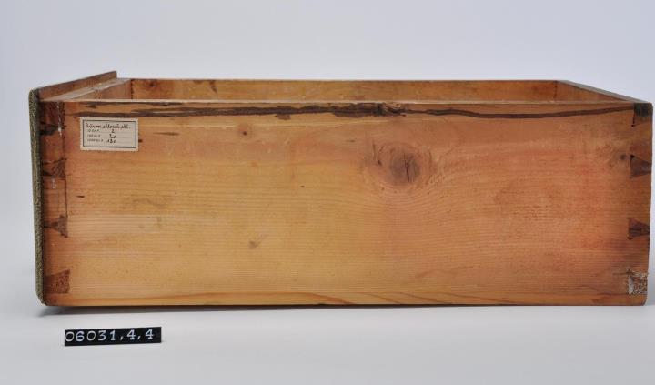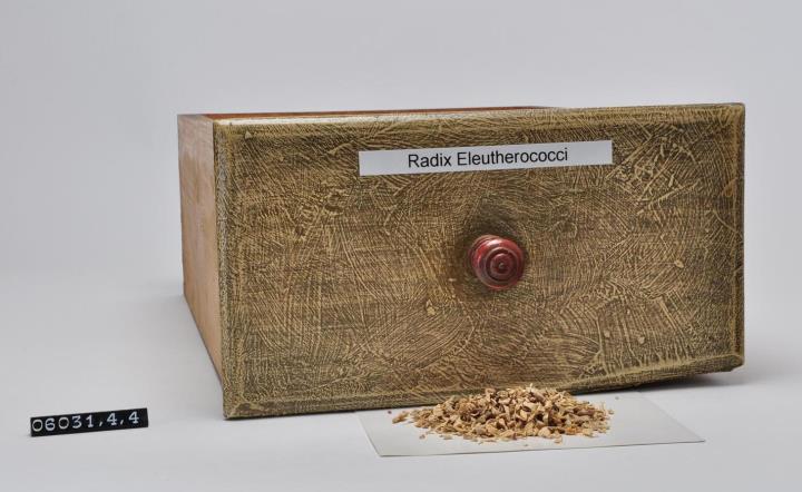 Schublade für Kräuterdrogen aus Nadelholz mit rotem Knauf. Vorderseite angeleimt, grau-braun maserierend angemalen. Die Schubladenseitenteile haben eine Schwalbenschwanzverbindung. Boden angeleimt und mit Holznägeln gesichert. Seitlich gezahntes Preisschild für Ammonium chloratum sbl.. Signatur mit Dymo-Band. Enthält Sibirische Taigawurzel geschnitten.