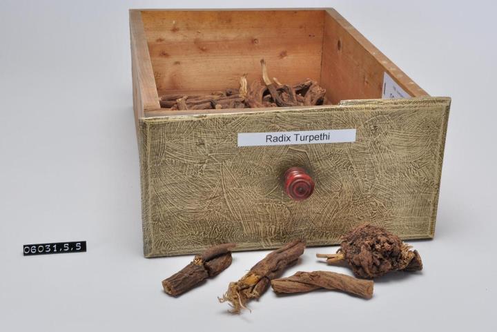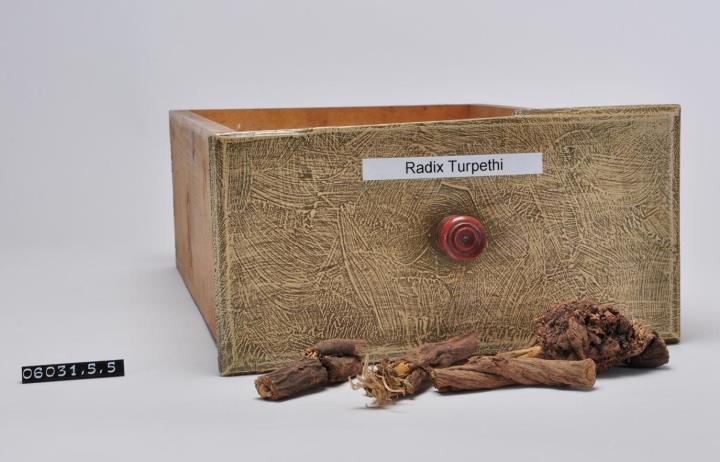 Schublade für Kräuterdrogen aus Nadelholz mit rotem Knauf. Vorderseite angeleimt, grau-braun maserierend angemalen. Oberkante teilweise abgebrochen. Die Schubladenseitenteile haben eine Schwalbenschwanz- verbindung. Boden angeleimt und mit Holznägeln gesichert. Signatur mit Dymo-Band. Enthält Turbith-Wurzel, Indische Jalape als Ganzdroge und geschnitten.