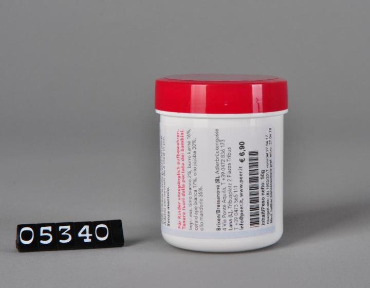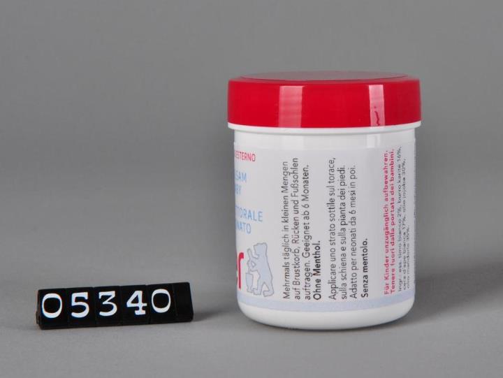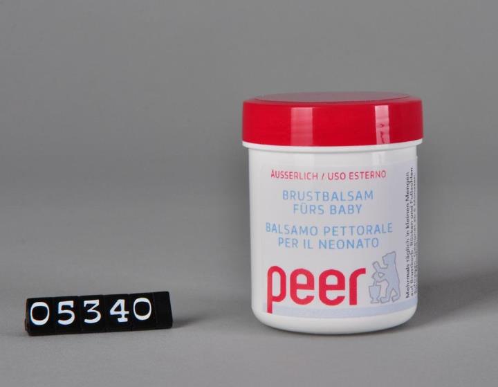 Weiße Salbendose mit rotem Schraubverschluss aus Polypropylen (PP) mit Standring. Bodenprägung: 50, 60ml und Receyclingsymbol für PP. Enthält 50g Brustbalsam für Babys. Bei Erkältungen, mehrmals täglich auf Rücken und Fußsohlen auftragen. Geeignet für Kleinkinder ab sechs Monaten.
