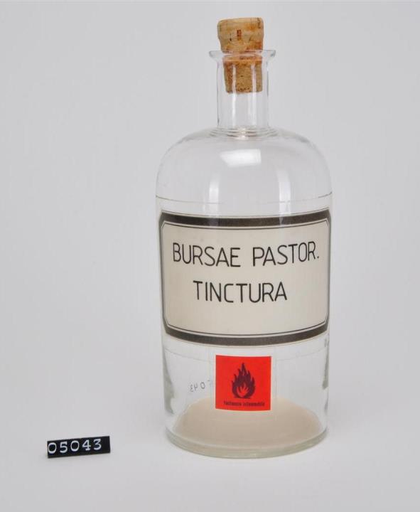 Runde, farblose Enghalsflasche mit Korkstopfen. Maschinell hergestellt, mit manuell aufgesetztem Hals, ausgebogender Mündungsand. Bodenprägung der Inhaltsangabe. Mit Schablone beschriftetes und mit Klarsichtfolie überzogenes Papierschild, achteckig, mit schwarzem Doppelrand und schwarzer Schrift auf weißem Grund. Darunter rotes Warnschild mit schwarz aufgedrucktem Flammensymbol. Ohne Inhalt.
