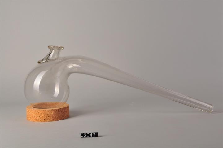 Destilliergefäß, Retorte: kugelförmiger Körper mit absteigendem Rohrteil (Schnabel). Obere Öffnung (Tülle), hergestellt durch Aufschmelzen eines kleinen Glaspostens und ausziehen desselben. Aufgelegter Faden am Mündungsrand.