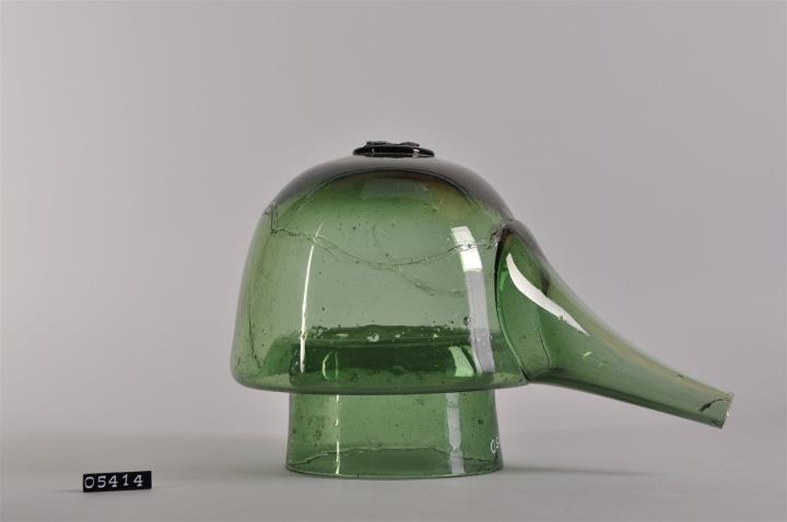 Alambik, Alambique, Alembicus, Destillierhelm, Brennhut, in der Alchemie auch Caput Mauri, Capitellum oder Galea genannt aus grünem Waldglas. Schnabel teilweise abgeschlagen. Viele Lufteinschlüsse. An der Oberseite abgebrochener Glasposten zum Anheben des Helms. Diente zur Trennung von Stoffen durch Erhitzen und anschließendes Abkühlen. Ähnlich der Retorte weist der Alembic ein langes, seitlich nach unten führendes Rohr auf, durch das das Destillat in ein Auffanggefäß abfließen kann Der Boden des Alembik ist jedoch offen, sodass er auf den eigentlichem Destillierkolben gesteckt werden kann.